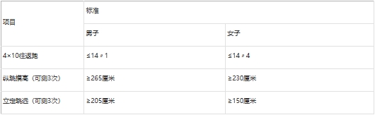 2.进行体能测试。体能测试项目为4×10米往返跑、纵跳摸高、立定跳远,三个项目中两个合格则体能测评通过,测评内容及标准如下: